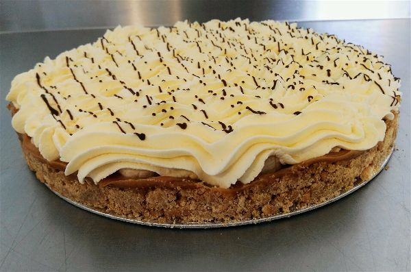 Banoffi pie is an English dessert made from bananas, cream and toffee from boiled condensed milk, on a base made from crumbled biscuits and butter. Our version includes chocolate sprinkled on top. A wickedly delicious desert!