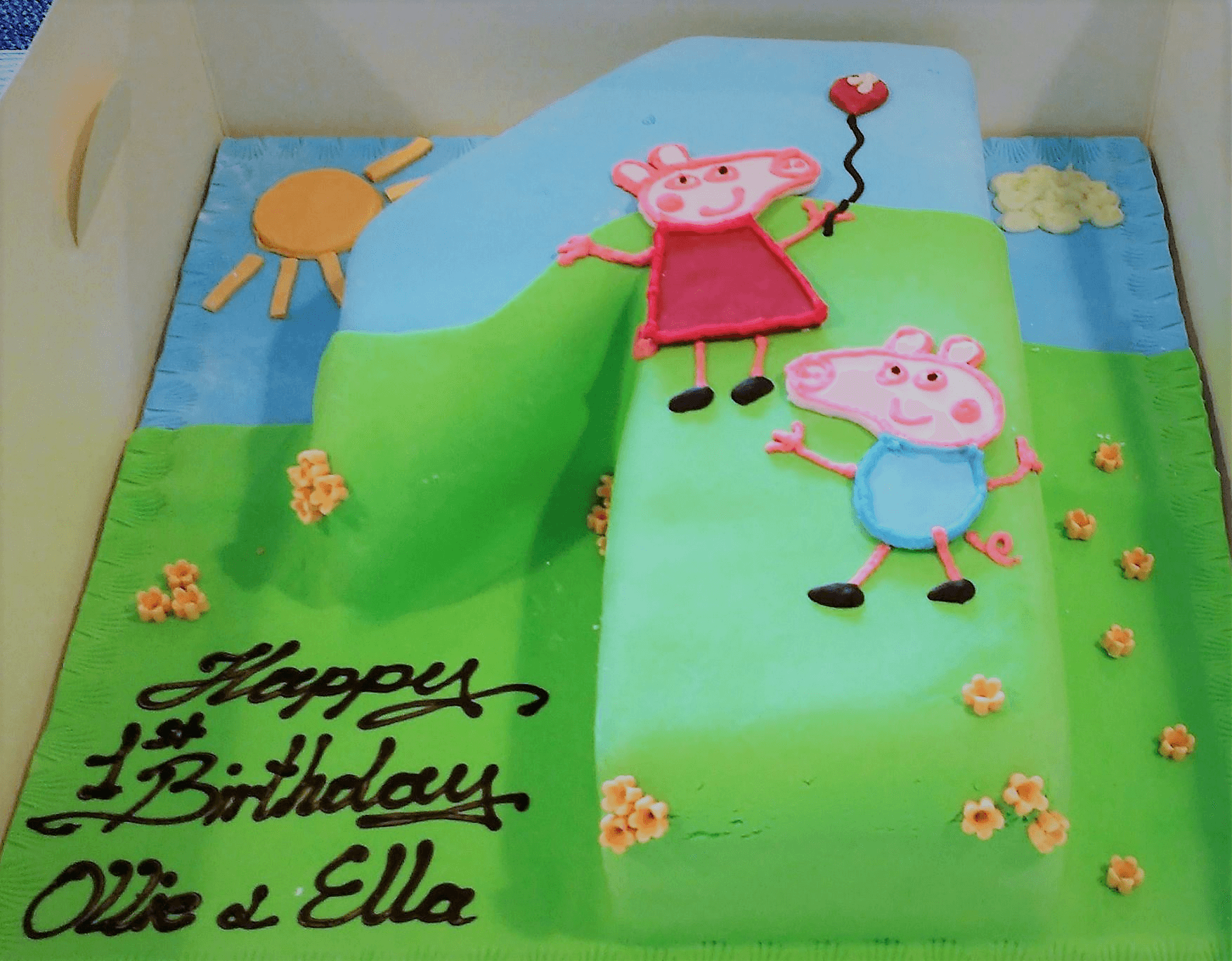 12" Themed number 1 cake. This is a Madeira sponge layered with buttercream and strawberry pie filling, finished then in shape of number 1.